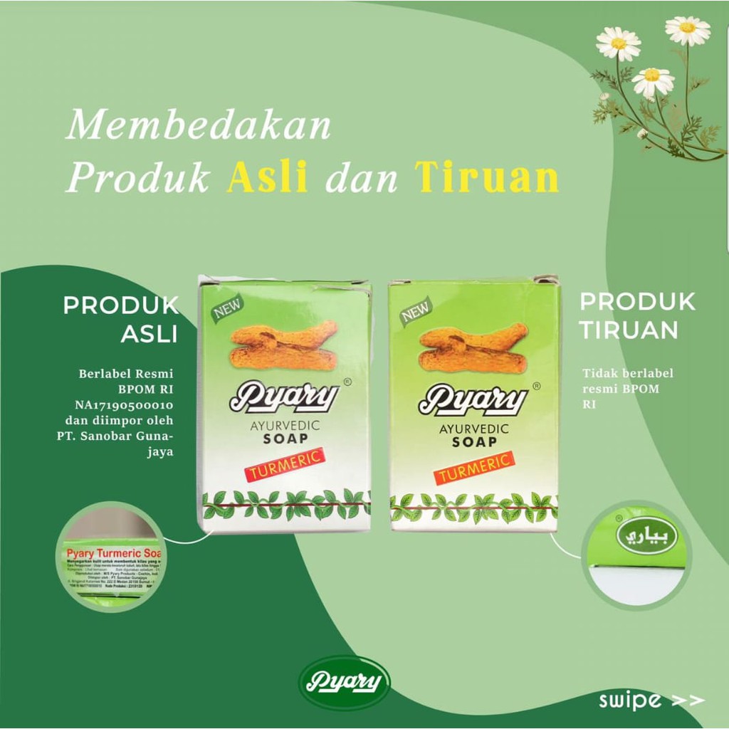 Beda dengan sabun pyary palsu yang gampang luntur. Kw tekstur terasa lebih lengket, sedangkan yang asli tidak. Tulisan gambar kunyit dan tulisan pyary pada kemasan tidak terlalu timbul 2. Kw sabunnya lebih tipis, sedangkan yang asli lebih tebal. Ready banyak silahkan langsung diorder 100% original, kita star seller ga jual barang palsu.
